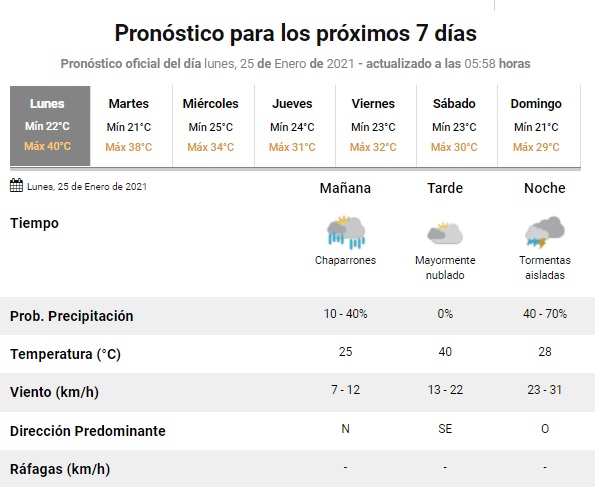 El Servicio Meteorológico Nacional (SMN) indica que en San Juan este lunes la máxima llegará a los 40ºC y la mínima es de 23,3ºC. Tras un fin de semana agobiante de calor con temperaturas elevedas, para hoy continuará el calor y anticipan tormentas.