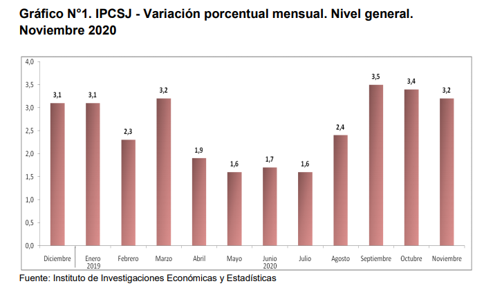 El informe muestra que el Nivel general del Índice de Precios al Consumidor de San Juan (IPCSJ), representativo del total de hogares de la provincia, registró en noviembre una variación de 3,2% con relación al mes anterior, acumulando en los primeros once meses del año una suba de 31,8%.