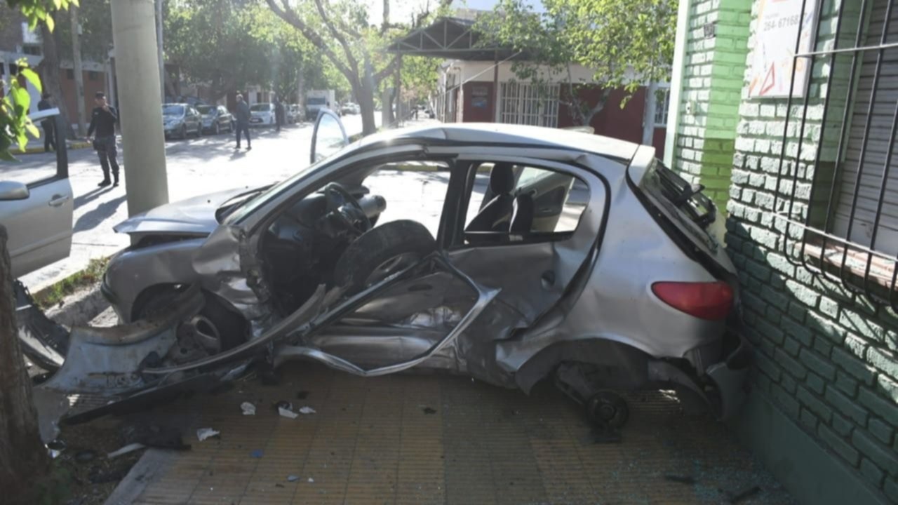 Este vehículo terminó destrozado y atascado entre un poste de alumbrado y la pared. El Peugeot 206 terminó tan destrozado que los rescatistas no podían sacar al automovilista que aún estaba en el habitáculo. Ante esta complicación, los bomberos llegaron al lugar y lograron sacar al conductor.