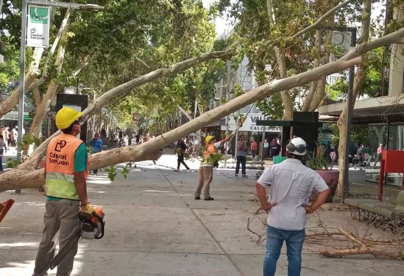 Tras las intensas ráfagas de viento sur que se registraron en la mañana de este viernes, un árbol terminó cayendo en plena peatonal. Las raíces se desprendieron del suelo y las ramas terminaron en el suelo, sobre calle Tucumán y Rivadavia.