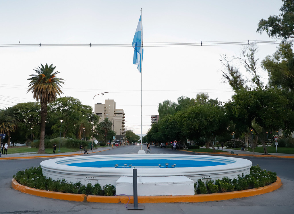 El sistema de impulsión de agua colocado está compuesto por una bomba sumergible de 5hp, 4 picos de bronce con un diseño especial tipo JET, para obtener un efecto de aguas espuma, con forma cónica y aspecto espumoso (enriquecedora de oxígeno), buena consistencia frente al viento con el fin de generar un chorro de agua más grueso y compacto, disminuyendo así la deriva y priorizando la seguridad vial. Es importante aclarar que el suministro de agua proviene de una perforación agua no potabilizada ubicada en el Parque de Mayo. Para esto se incorporó una operación más al sistema de riego automatizado con el fin de abastecer la fuente. Además, es un sistema de recirculación por lo que el caudal añadido será mínimo.