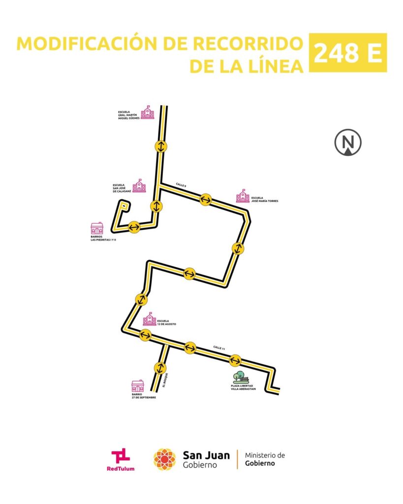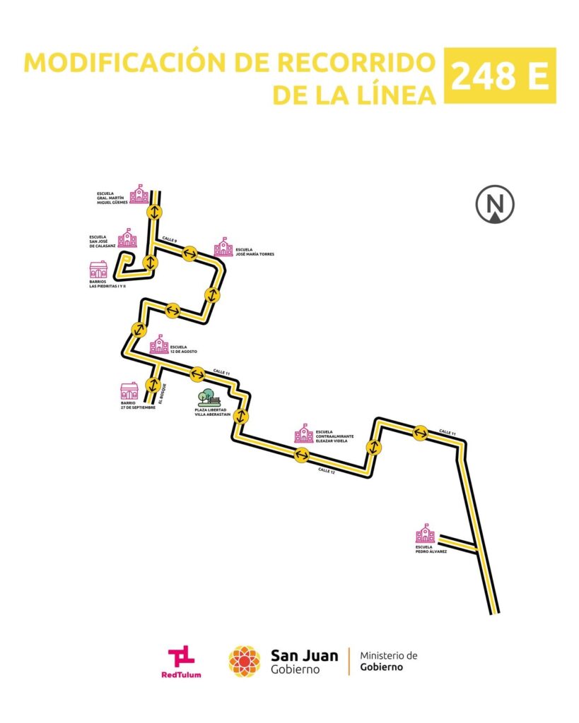 El Ministerio de Gobierno, a través de la Dirección de Coordinación de RedTulum, logró la creación de una extensión en la línea 248 (que tendrá la denominación “E”)  con el objetivo de optimizar el servicio en la zona comprendida por siete localidades del departamento Pocito. Este nuevo recorrido comenzará a funcionar el viernes 1 de agosto de 2025.