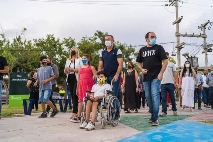 Este espacio verde tiene la particularidad de contar con juegos integradores para que pequeños con discapacidad también puedan disfrutar, jugar y divertirse, con aparatos seguros y adaptados para ellos. Es por eso que también se hicieron presentes los chicos con los que permanentemente trabaja el Área Discapacidad, de la Municipalidad de Rivadavia. Los pequeños entregaron un obsequio al intendente. Y el momento más emotivo se vivió cuando Juan recibió una nueva silla de ruedas.
