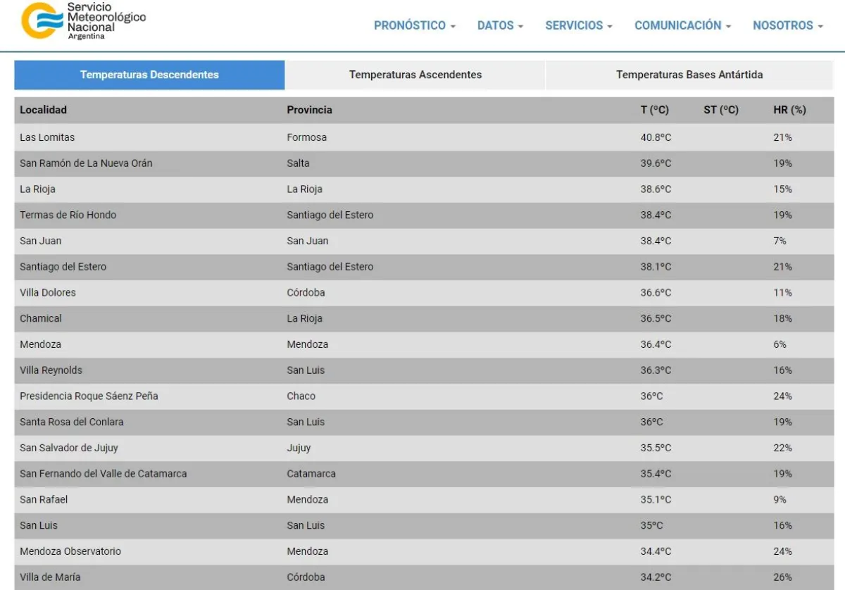 El ránking del Servicio Meteorológico Nacional lo encabezó Formosa con 40.8°, lo siguio Salta con 39.6°, La Rioja con 38.6°, mientras que San Juan y Santiago del Estero comparten la máxima de 38.4°.